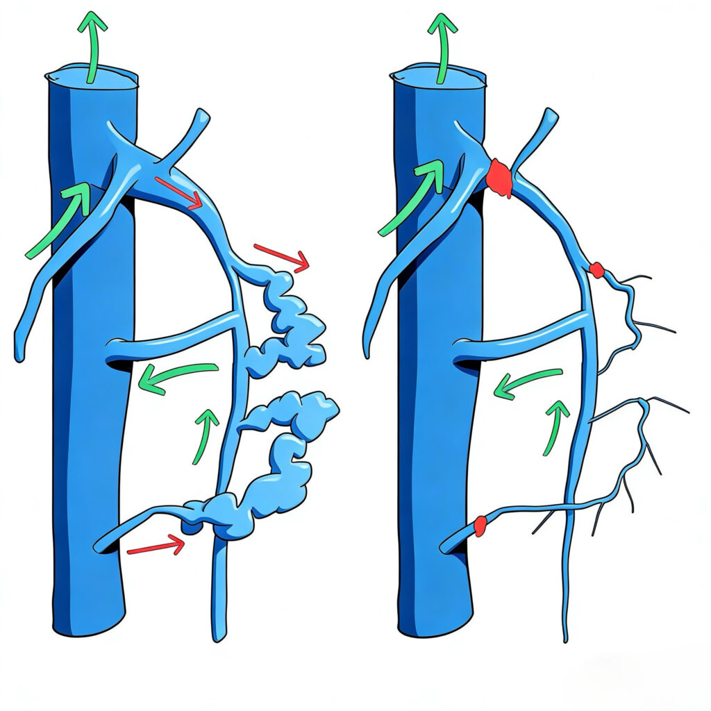 In this context, the saphenous vein is not merely a pathological conduit, but a functional component of the circulatory system, contributing to pressure redistribution and long-term adaptation.